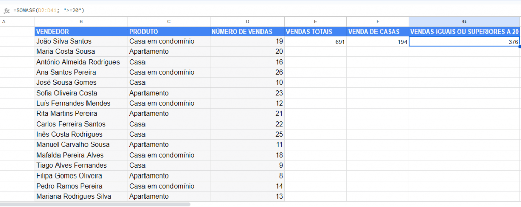No nosso exemplo, vamos somar apenas as vendas de apartamentos e considerar apenas os vendedores que venderam 20 ou mais unidades.