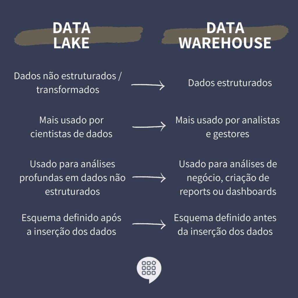 O data warehouse é um local usado para armazenar grandes quantidades de dados do negócio e suportar atividades de análise e business intelligence. Ele se diferencia do data lake nos seguintes aspectos: