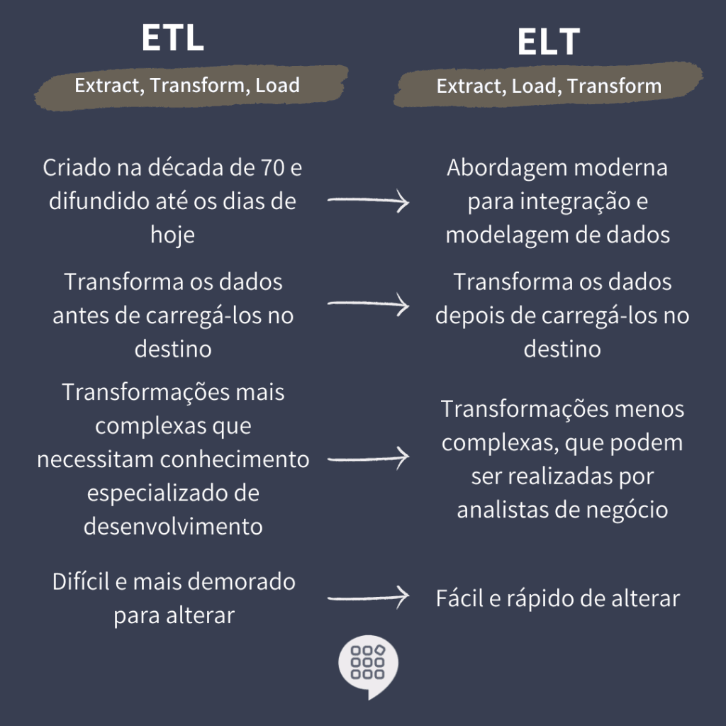 A sigla ELT significa "Extract, Load, Transform", ou em português "Extrair, Carregar, Transformar", e refere-se ao processo usado para replicar dados de uma fonte em uma base de dados. No ELT, os dados são extraídos da fonte, carregados no seu destino e só então transformados.