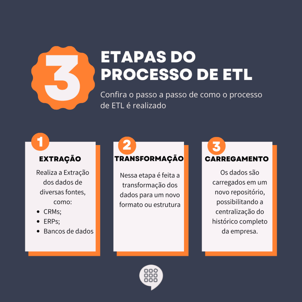 O ETL (extract, transform, loading) é um um processo de integração de dados que compila informações originárias de diversos silos em um único banco de dados, onde será possível cruzar essas informações e guardar o histórico completo das diversas áreas de uma empresa em um único lugar.