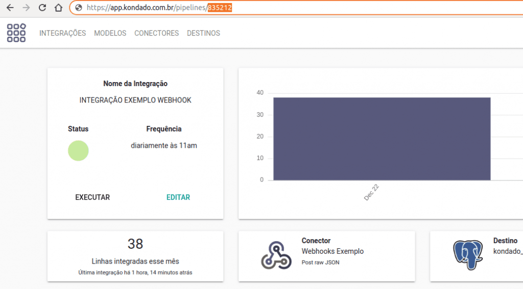 5) Uma vez criada a integração, acesse-a e, na barra de endereço do seu navegador, copie o id da integração, que é o código numérico ao final de "app.kondado.com.br/pipelines/XXXX"