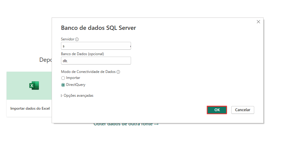 Selecione a opção “DirectQuery” para que os dados sejam atualizados no Power BI à medida que forem atualizados no seu banco de dados.