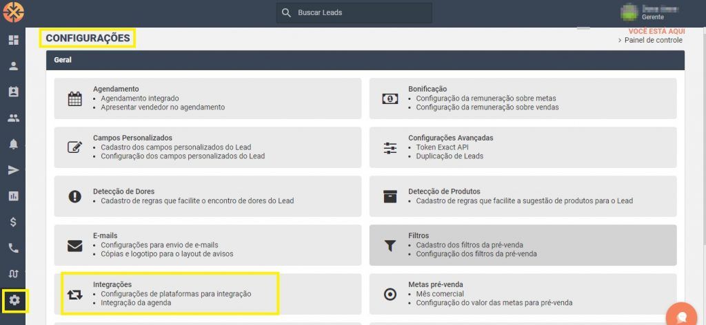 2. Vá em "Configurações" (engrenagem ao lado esquerdo) e depois em “Integrações”