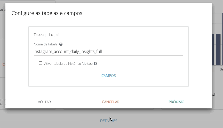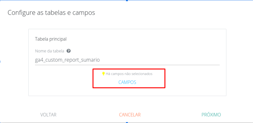 Caso seja feita a inclusão de métricas, dimensões ou campos, é necessário que os novos campos sejam marcados na sessão “Campos” da tela de configurações de tabelas e campos. Caso contrário, eles não serão enviados à tabela de destino. Tal como os usuários podem, por conta própria, criar suas colunas de acordo com suas necessidades, também podem recalculá-las de acordo com as modificações feitas dentro do próprio conector.