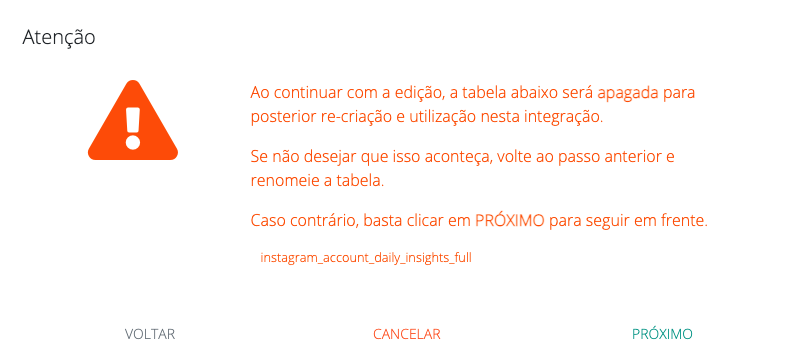 - Por padrão, a edição avançada reseta o savepoint da integração e apaga a tabela de destino, recarregando os dados a partir da data de savepoint redefinida. Você receberá um aviso (como no exemplo abaixo) no penúltimo passo da edição. A tabela somente é apagada caso seja mantido o mesmo nome de tabela desta ou de outras integrações.