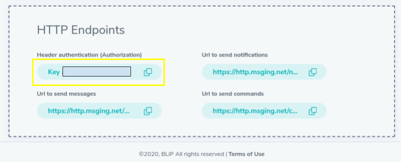ATENÇÃO: É importante copiar o campo “Header authentication (Authorization)” exatamente como está no Blip, incluíndo a palavra Key caso ela esteja lá