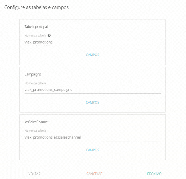 7. Defina o nome que a tabela terá no seu destino de dados, e, se habilitado, escolha a opção de inserir ou não tabelas deltas. As variáveis de inclusão dessas tabelas de histórico são especificadas unicamente pelo destino selecionado. Clicando em “CAMPOS”, você pode visualizar todos os campos que serão criados na tabela e pode escolher por não enviar algum deles ao remover o “check” (como padrão, mandamos todos):