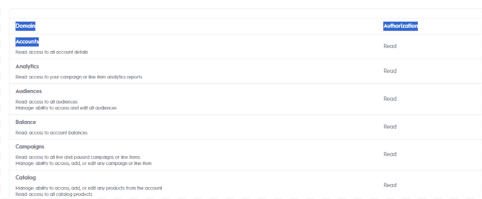 8. Na seção de "Authorization", coloque a opção "Read" para todas as linhas e clique em "Activate App"