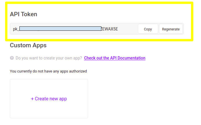 3) Na seção “API Token”, clique em “Generate” caso ainda não tenha uma chave API, ou então em “Regenerate”, e copie o valor gerado: