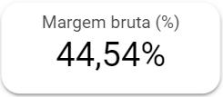 Margem Bruta (%): Este campo representa informa a margem bruta percentual de acordo com os filtros selecionados. Trata-se do valor da Receita total (“itens_quantidade” * “itens_valor_unitario”) subtraído do Custo total de produtos (“itens_quantidade” * “produto_preco_custo”), dividido pela receita total.