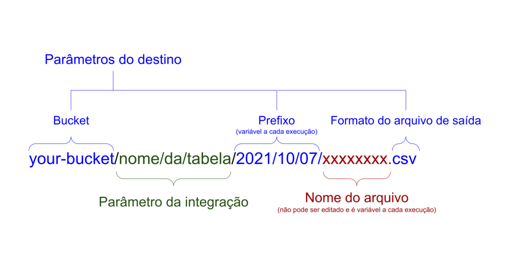 As tabelas/pastas são a parte “fixa” da inserção dos arquivos, quer dizer, os arquivos sempre serão enviados para o mesmo caminho bucket/pasta. A criação de “sub-pastas” com o parâmetro de prefixo premite maior dinamismo, sendo possível especificar pastas para anos, meses, dias, horários, etc diferentes, que serão alterados conforme o momento de execução da integração.
