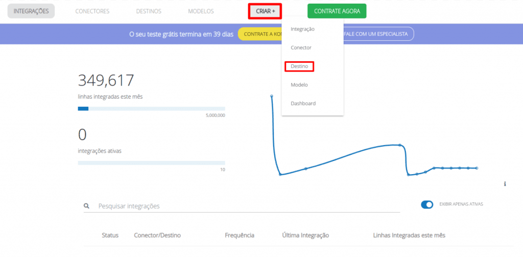 2) Após logado, clique em "CRIAR +"e depois em "DESTINOS":