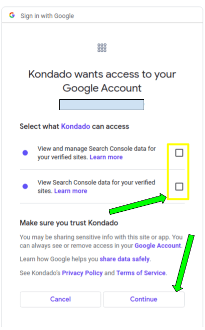 4) Na próxima tela, marque TODAS as permissões que são requisitadas e clique em Continue