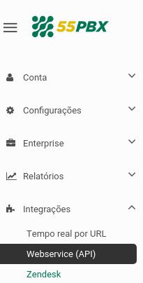 1) Faça login na plataforma do 55PBX e, no menu à esquerda vá em Integrações, depois Webservice (API)