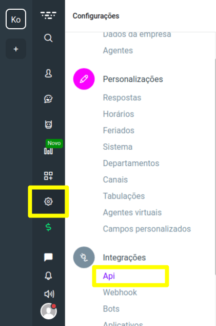 1) Acesse a sua conta Huggy e, na barra lateral esquerda, selecione configurações (engrenagem) e depois, em Integrações, selecione "API"