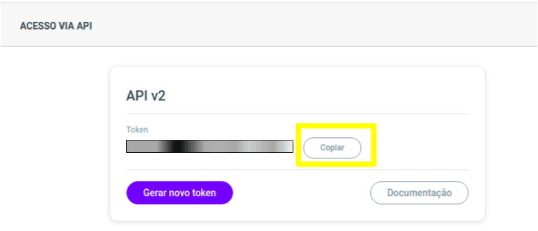 2) Na página de acesso via API, clique em "Copiar" para copiar o seu token