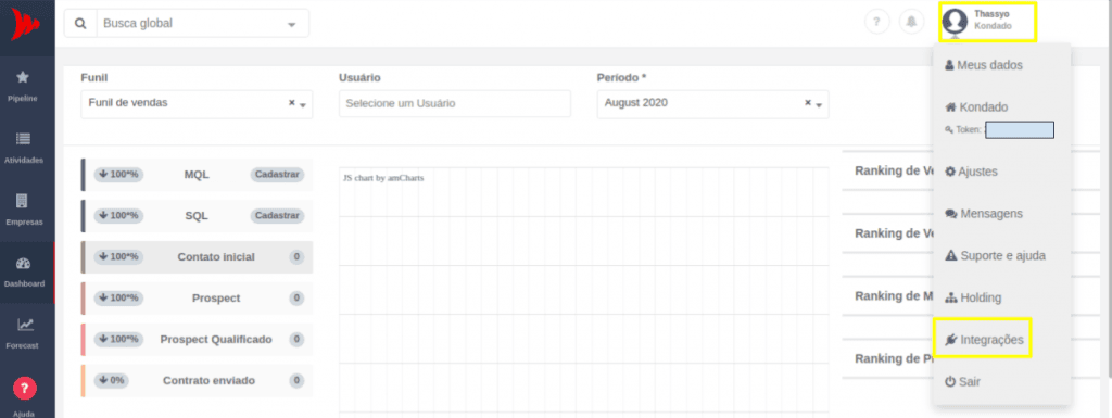 2) Uma vez logado, na barra superior à direita, clique no seu nome e, no menu que irá se abrir, clique em "Integrações"