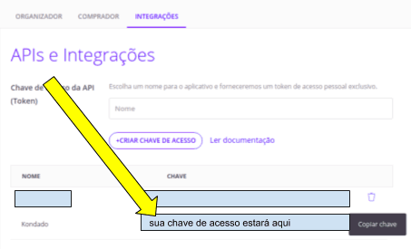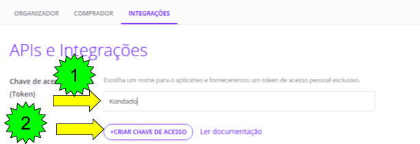 4) Na página de integrações, a primeira seção será a de criação de token de acesso. Na caixa de texto, (1) forneça um nome para a nova chave de acesso (por exemplo, "Kondado") e (2) clique em "+CRIAR CHAVE DE ACESSO"