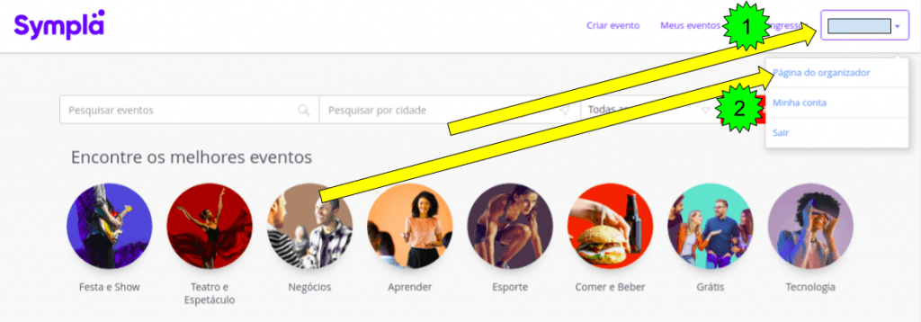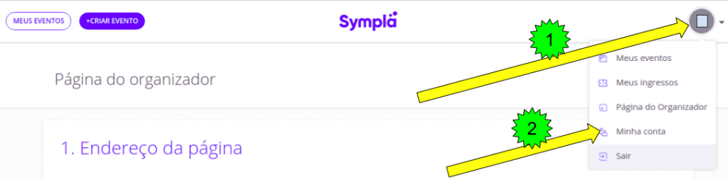 1) Faça login na sua conta do Sympla e, à direita no menu superior, (1) clique no seu nome e (2) em "Página do organizador"
