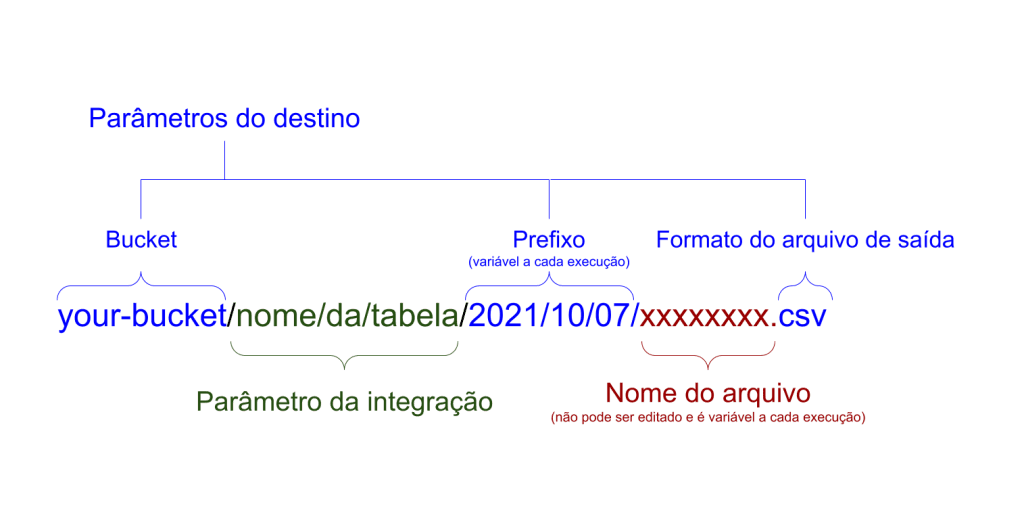 Bucket onde os arquivos foram enviados. Corresponde ao bucket cadastrado por você nos parâmetros do destino no momento em que a integração salvou os arquivos