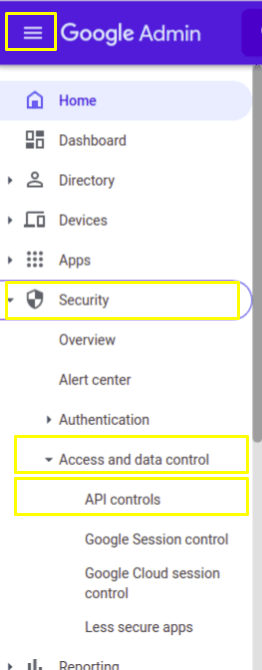 2) No menu lateral (acessado pelas 3 barras horizontais na parte superior esquerda) acesse Security > Access and data control > API controls