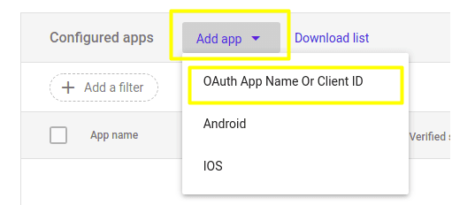 4) Na lista, procure pela opção "Add app" > "Oauth App Name Or Client ID"