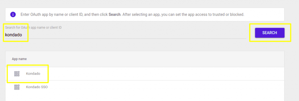 5) Na barra de busca, digite "kondado" e clique em "SEARCH", depois selecione a opção com App name "Kondado" (e apenas esta opção)