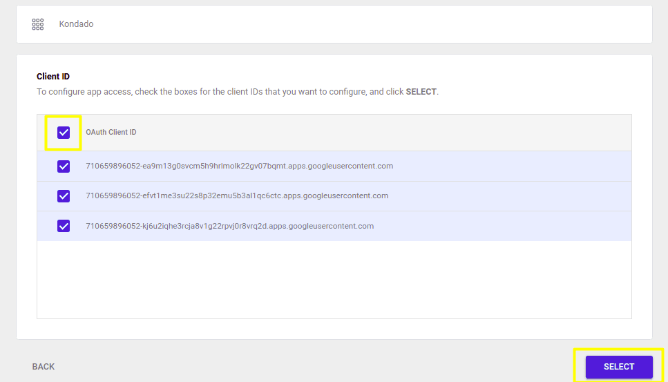 6) No próximo passo, autorize todos os Client IDs listados e depois clique em "SELECT"