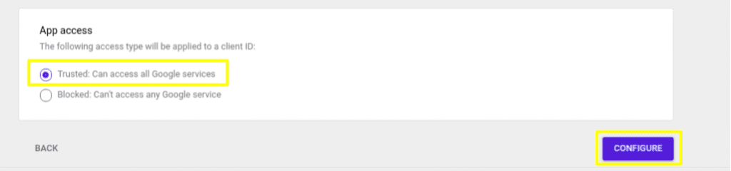 7) No próximo passo, selecione a opção "Trusted: Can access all Google services" e depois clique em "CONFIGURE"