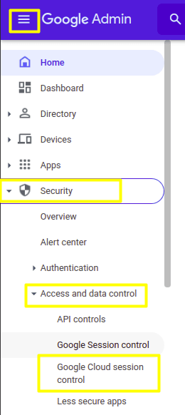 8) Agora que a Kondado está configurada como um App confiável, caso sua organização ainda não tenha feito, será necessário eximir os apps confiáveis de requerer reautenticação. Para isso, acesse novamente a barra lateral esquerda pelos 3 traços horizontais na parte superior esquerda > Security > Access and data control > Google Cloud session control