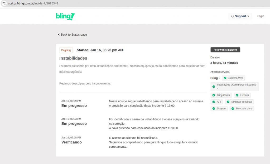 - Atualização 20:00: Seguindo a indicação da página de status do bling (imagem 533.2) e após realização testes nossos, não detectamos mais instabilidades. Iremos reabilitar a execução das integrações. Seguiremos acompanhando a resolução do aviso de instabilidade do bling, que atualmente encontra-se no estado “Verificando”
