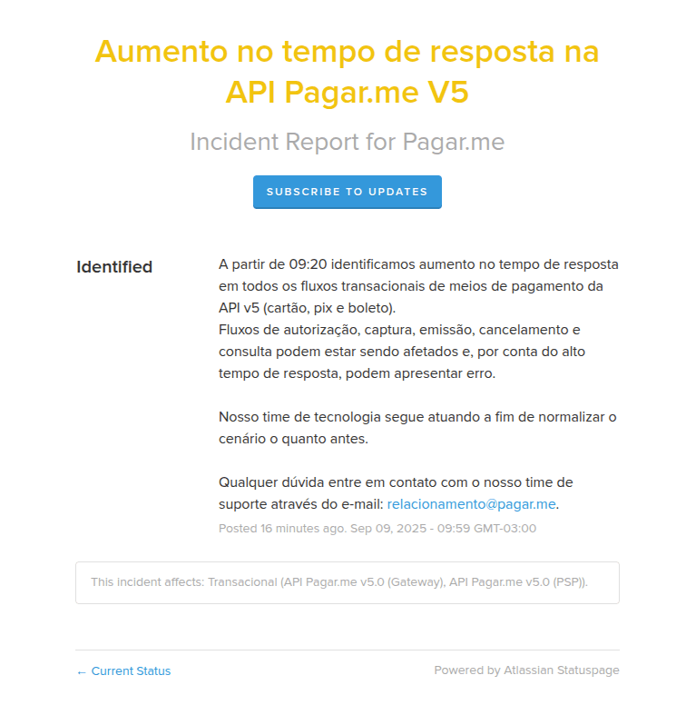 - Atualização 04:32 BRT: Como medida de contenção, suspendemos todas as integrações, independentemente do destino, enquanto investigávamos o problema