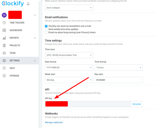 3) Na seção API você encontrará a sua API key (clique em "Generate" caso ainda não tenha a sua API key). Copie este valor