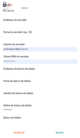4) Dê um nome para o seu conector e preencha as informações do seu servidor intermediário e depois do seu banco de dados. Em “Chave PEM do servidor” basta copiar o texto do arquivo com a chave PEM.