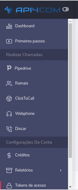 1) Faça login na sua conta da Api4com e no painel à esquerda clique em "Tokens de acesso"