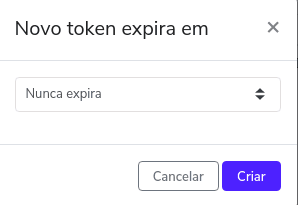 3) No pop-up que irá abrir, selecione a opção de expiração como "Nunca expira" e clique em criar