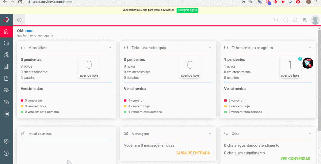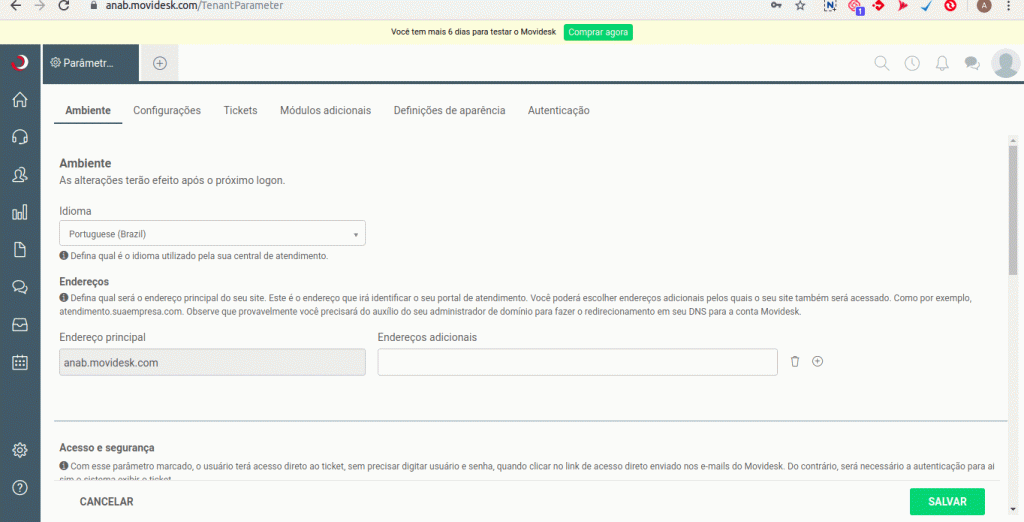 1) Faça login na sua conta do Movidesk e, no painel esquerdo clique em configurações e depois em parâmetros