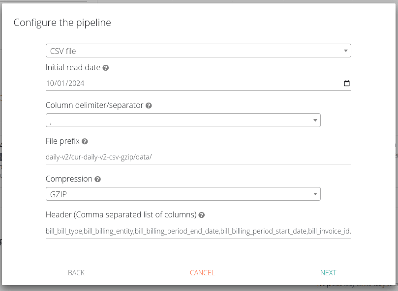 4. Compressão: Escolha GZIP caso esta seja a compressão aplicada a seus arquivos ou CSV caso não haja compressão. Ao escolher GZIP, seu arquivo deve ter extensão ".gz" ou ".gzip" e possuir apenas um arquivo dentro do ficheiro. Caso escolha CSV seu arquivo deve ter extensão ".csv"