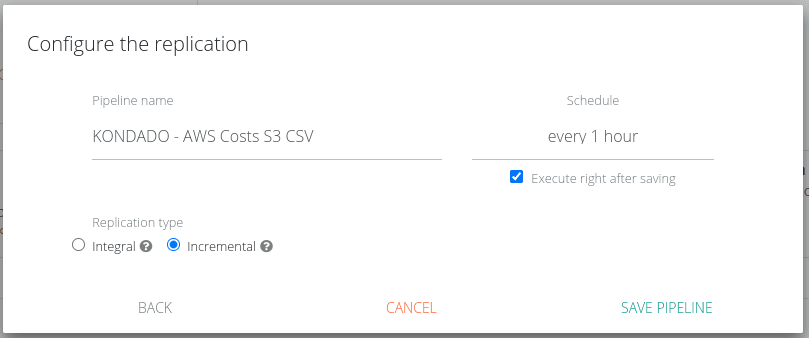 Caso escolha Integral, todos os arquivos que correspondem ao prefixo sempre serão lidos e caso algum arquivo seja apagado entre uma execução e outra ele também será apagado de sua tabela, o que não acontecerá caso sua replicação seja Incremental, por isso este tipo de replicação é indicada para casos em que há deleção (e não apenas alteração) de arquivos. Esta replicação pode aumentar seu número de registros