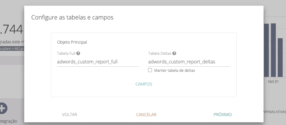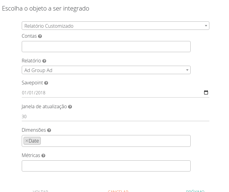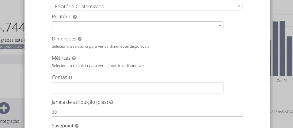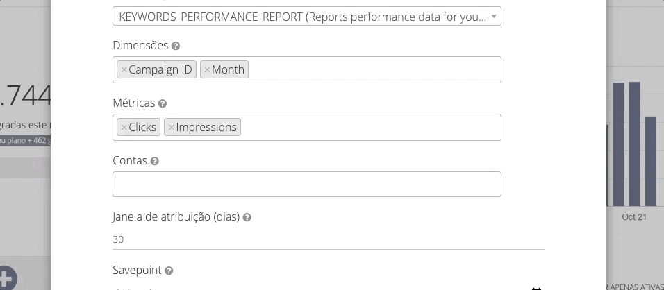 Caso seja requisitado, selecione então uma janela de atualização/atribuição (indica quanto tempo dados do passado continuarão sendo atualizados) e um savepoint. O savepoint é a data a partir da qual os dados serão buscados dentro da ferramenta e integrados ao seu banco de dados: