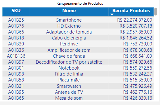 Ranqueamento de Produtos: Tabela que apresenta em forma de ranqueamento os 5 produtos que tiveram mais receita no período.