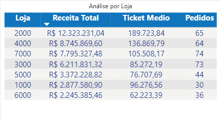 Análise Lojas: Tabela com a listagem de todos as Lojas que tiveram vendas no período selecionado, detalhando a receita de produtos, o ticket médio e o número de pedidos.