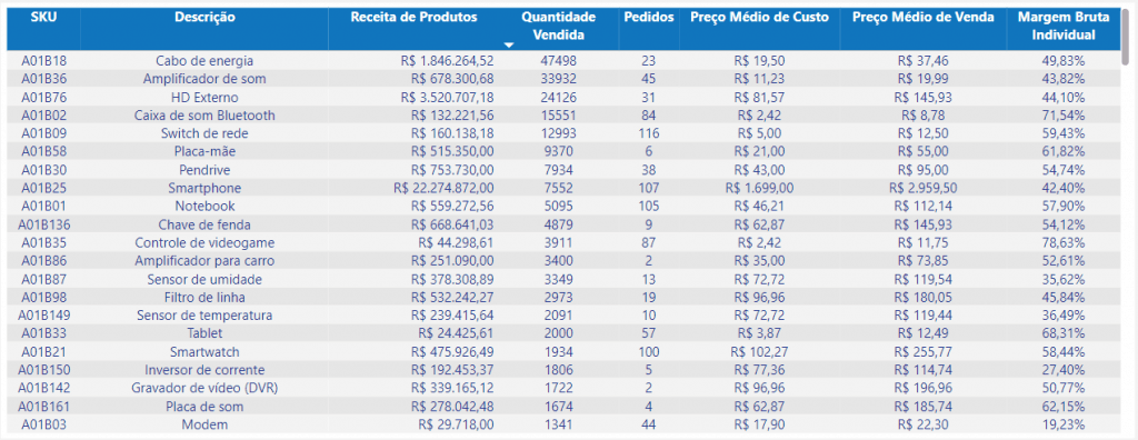 Página do Dashboard que tem como principal objetivo fornecer informações de vendas baseadas nos produtos, tais como: Quantidade vendida; Pedidos; Preço médio de custo; Preço médio de venda e Margem individual bruta. É possível ver informações individuais por produto. Abaixo há uma descrição detalhada de cada campo, assim como imagens e exemplos.