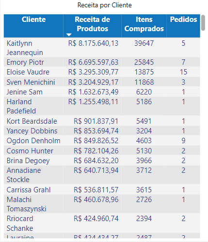 Receita por cliente: Tabela que apresenta informações de receita de produto, quantidade de itens e quantidade de pedidos por cliente, de acordo com os filtros selecionados.