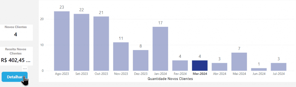 - Obs: Selecionando a barra de um mês específico, clique no botão “Detalhar” e para visualizar uma tabela com os dados destes clientes novos, de acordo com as imagens abaixo:
