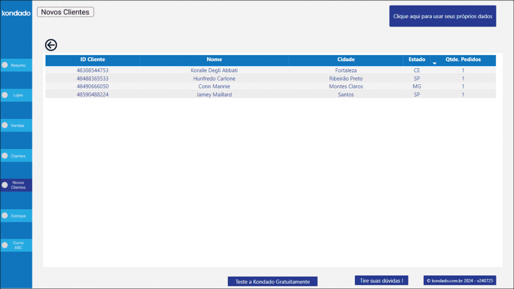 Página do Dashboard que quantifica os clientes, assim como os clientes novos por período filtrado.. Dessa maneira, é possível filtrar um período específico para analisar o resultado de uma campanha de marketing, por exemplo.