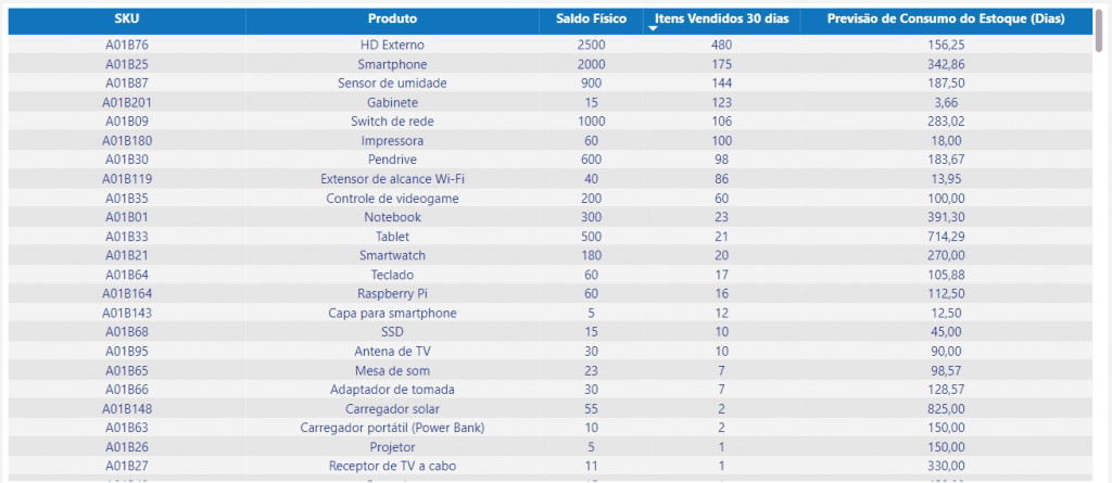 Tabela estoque: Tabela que apresenta as informações de estoque físico atual, itens vendidos nos últimos 30 dias e previsão de consumo do estoque físico em dias, de cada produto individualmente.