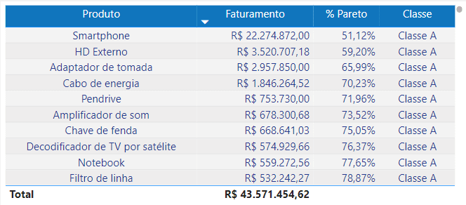 Filtro de Classe: Filtro que pode ser utilizado para mostrar apenas uma das classes de produto, A, B ou C.