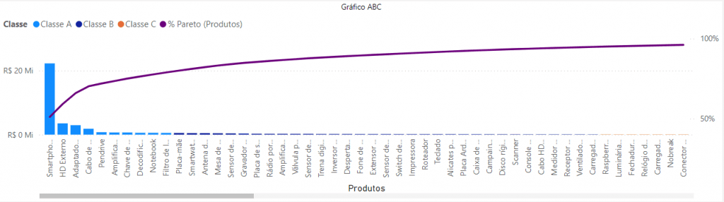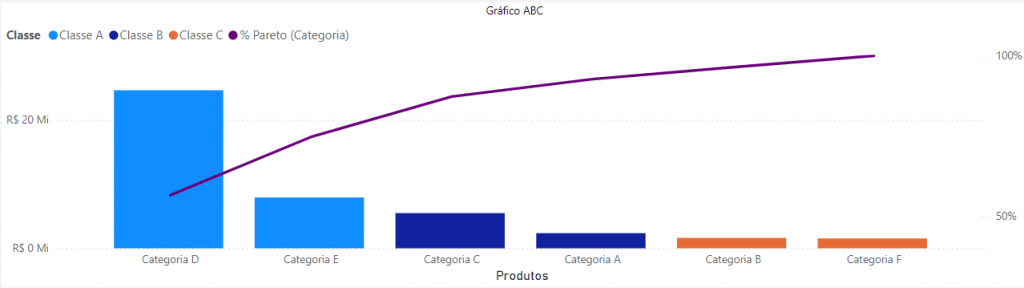 Gráfico Curva ABC: Gráfico que apresenta as informações de curva ABC por produto e categoria em forma de visualização gráfica de colunas e linhas. Todas as informações variam de acordo com o período selecionado e o filtro de Classe.