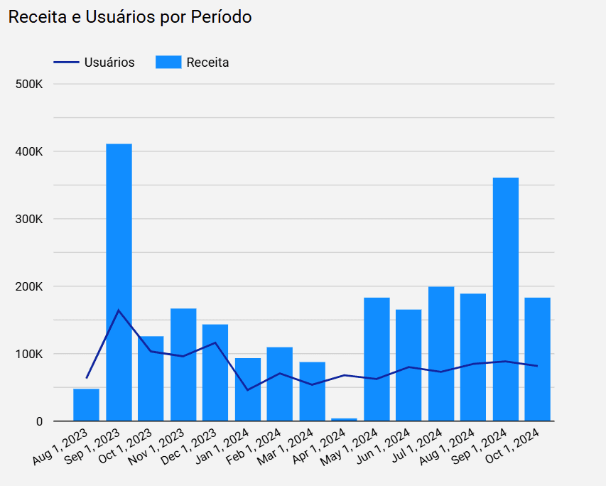 Gráfico Receita e Usuários por Período: Gráfico de visualização em eixo duplo, que permite analisar a relação entre receita e volume de usuários em cada período.